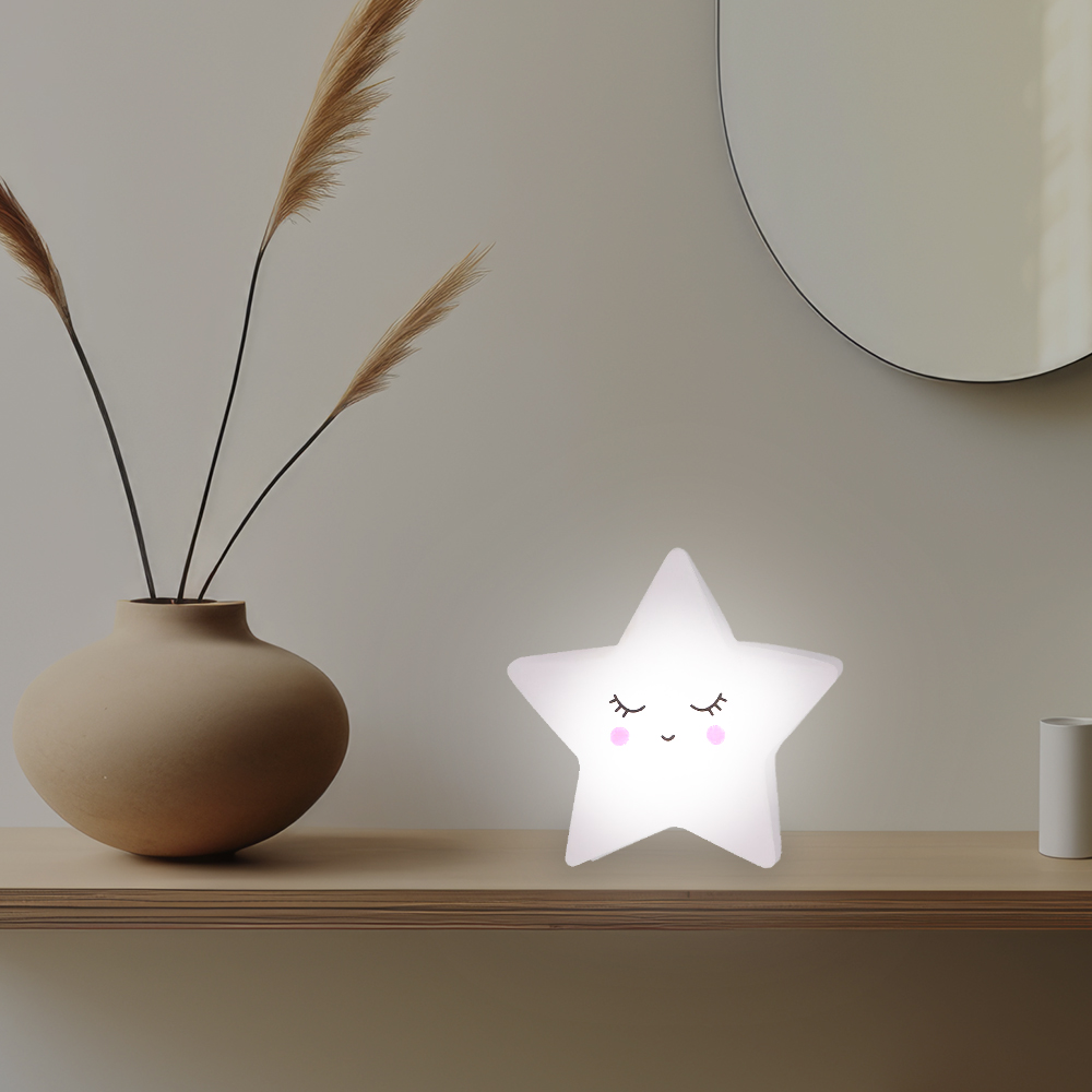 Mini luminária de estrela LED que oferece uma luz suave e agradável, ideal para ambientes como quartos infantis ou para quem tem medo do escuro. A iluminação é projetada para não prejudicar a visão e as lâmpadas são seguras e não superaquecem. Funciona com bateria (inclusa), tornando-a uma opção econômica e prática para decorar e embelezar qualquer espaço.